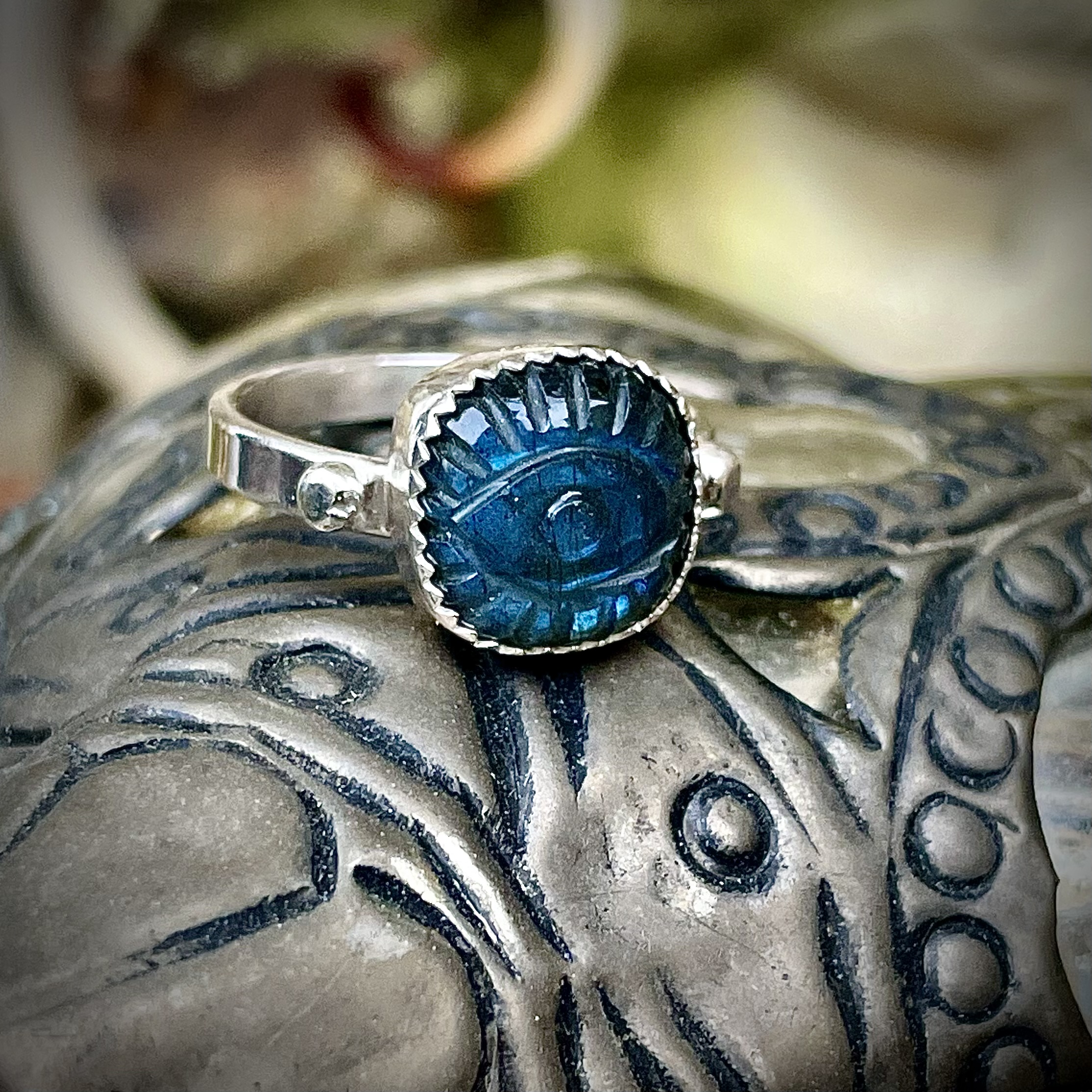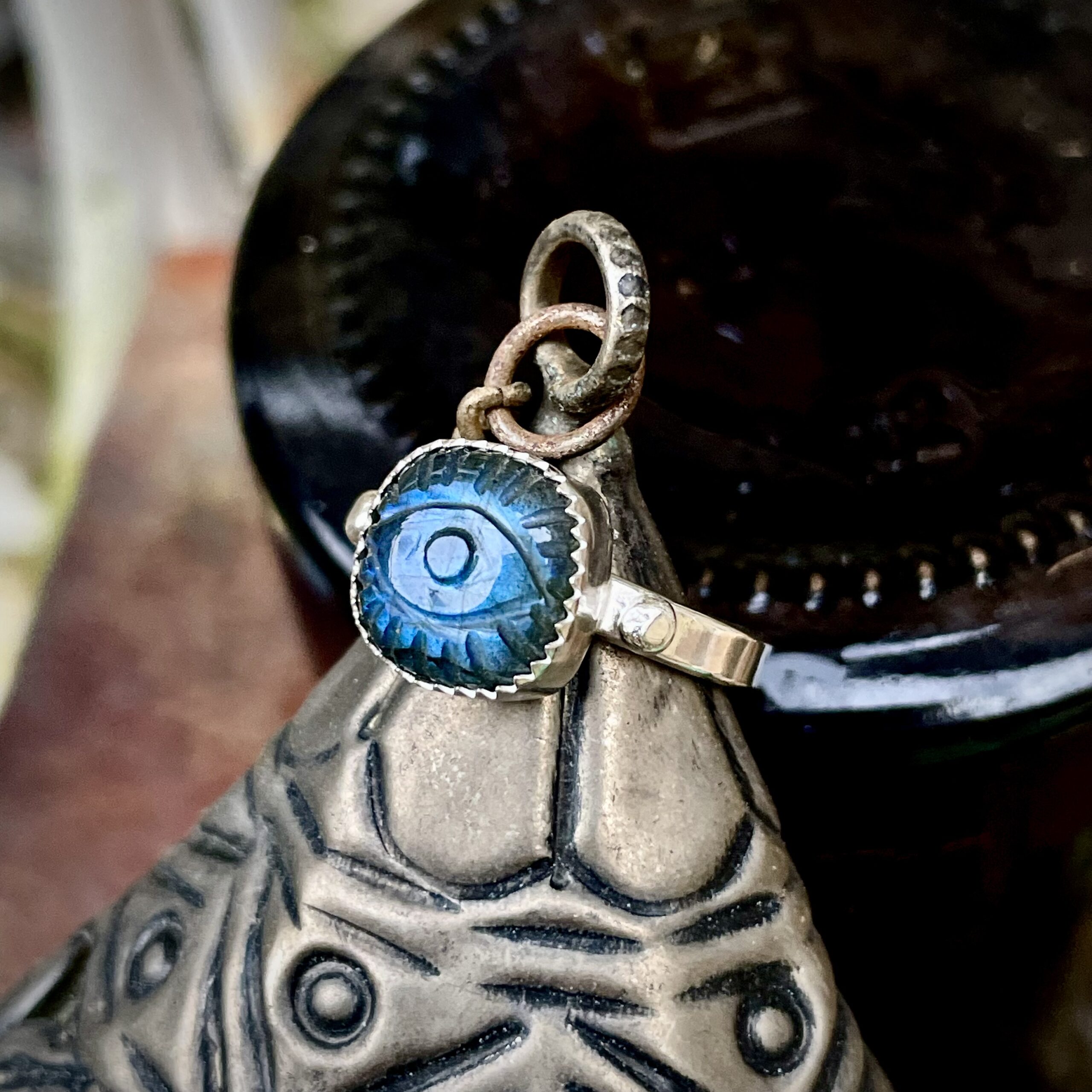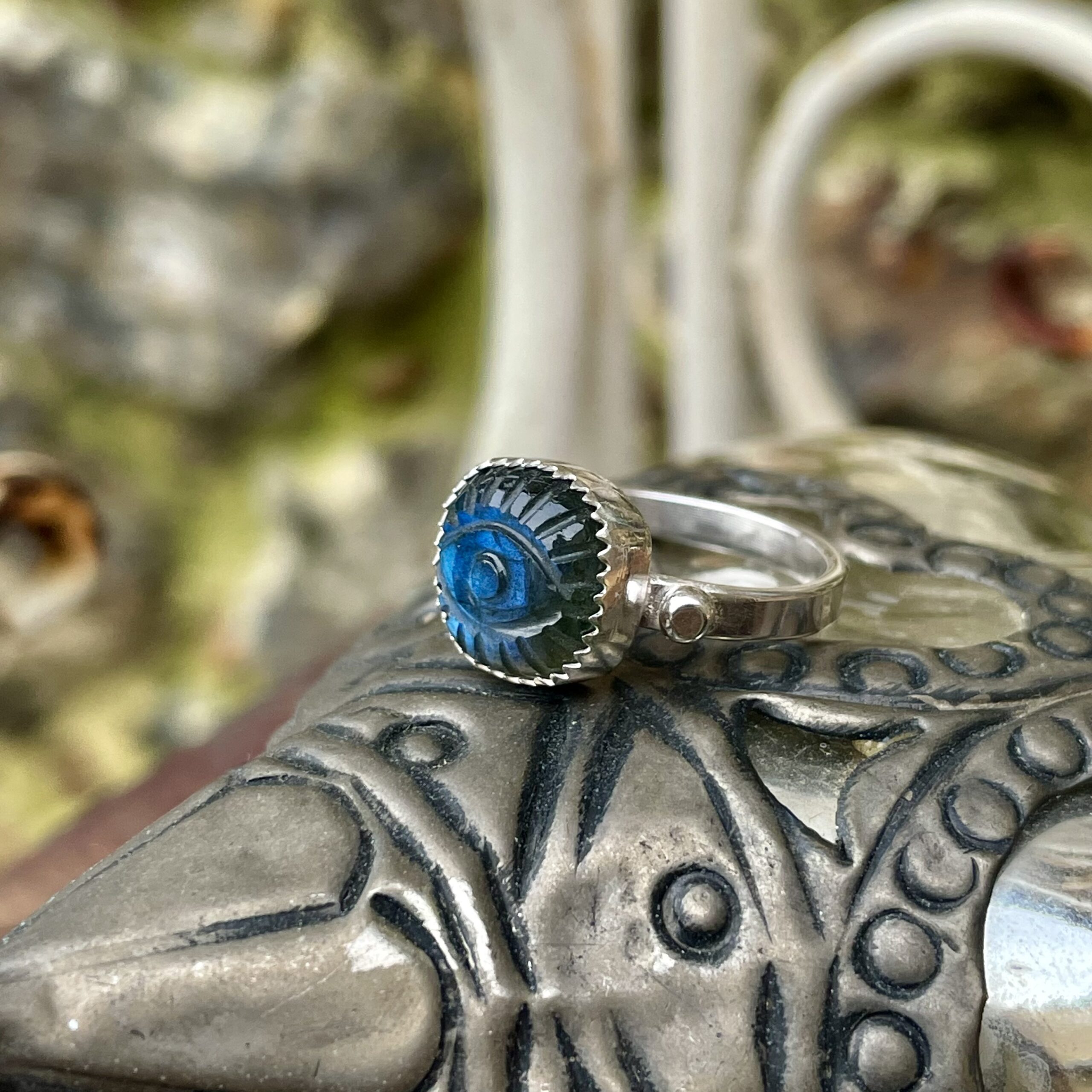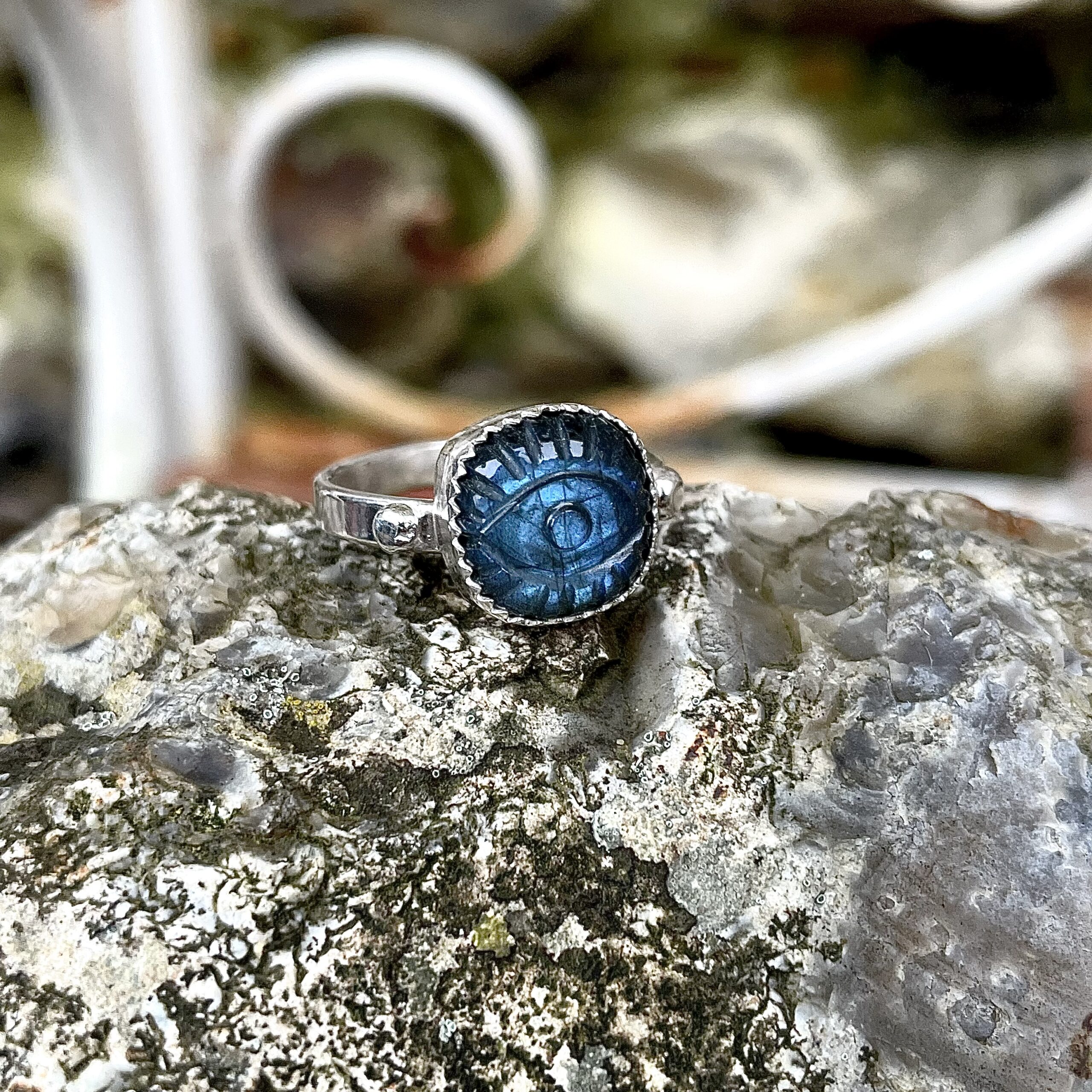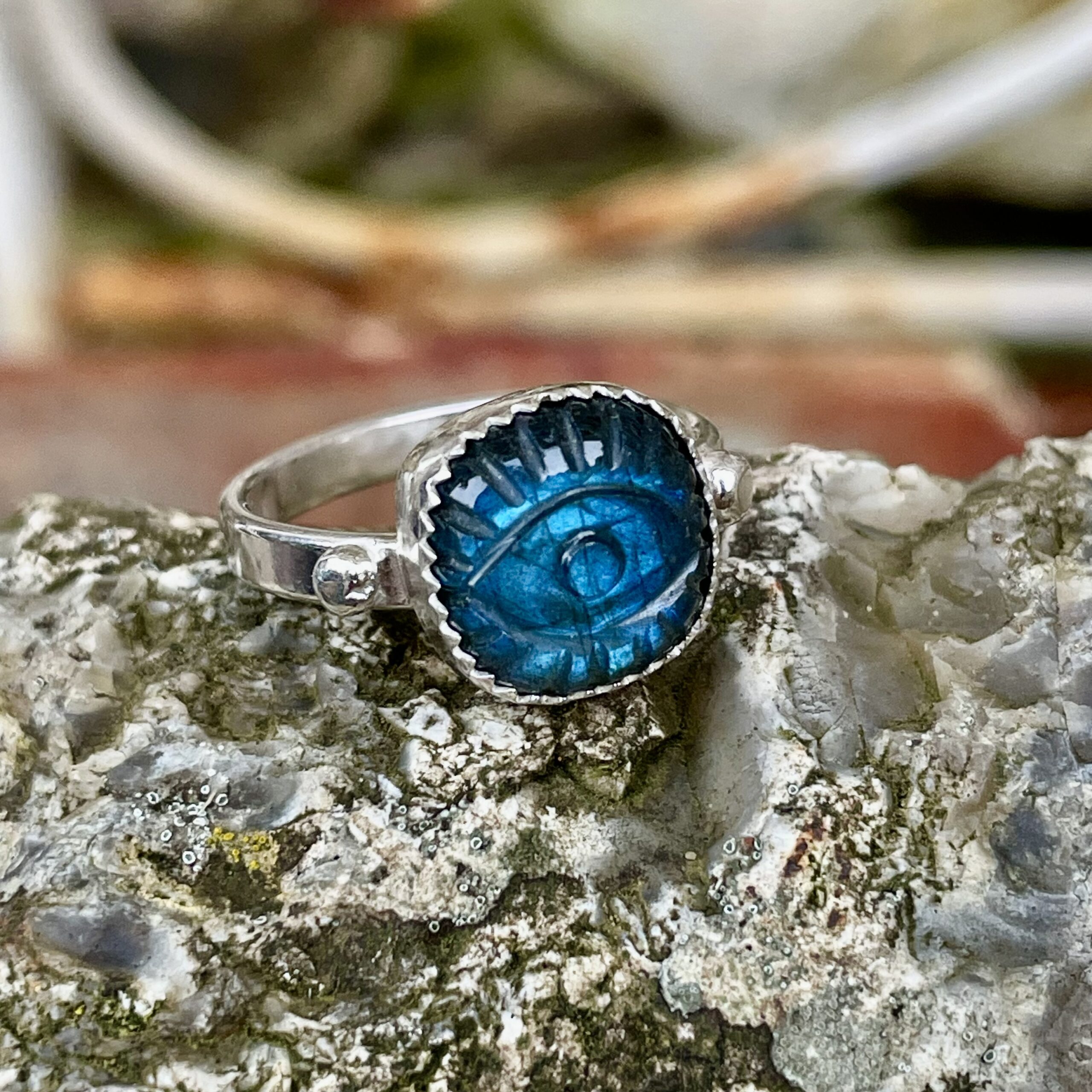 A sterling silver Evil Eye Protection Ring set with luminous Labradorite – made with intention and care.
