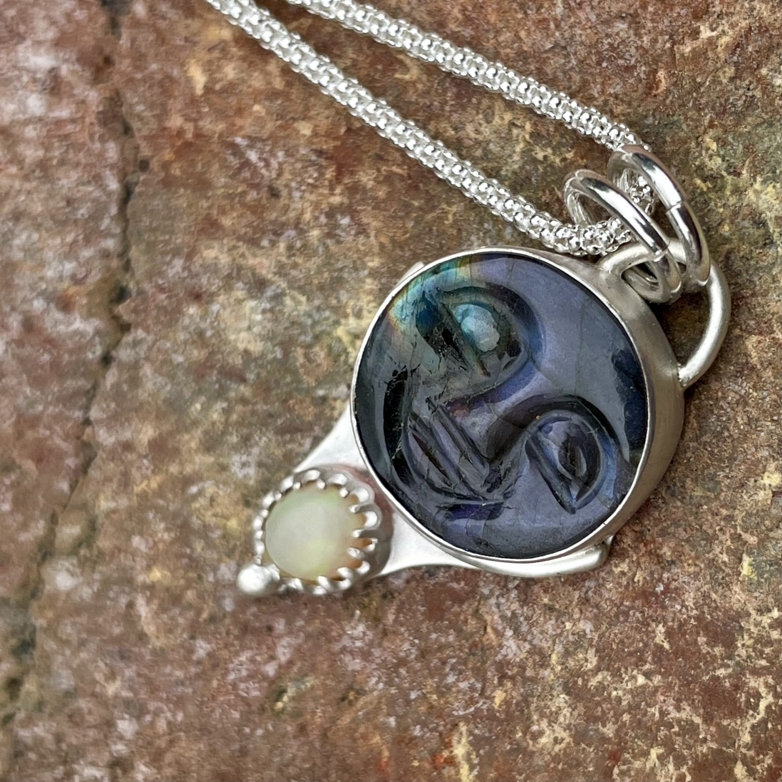 A stunning flashy labradorite and opal sterling silver pendant showcasing beautiful rainbow hues.