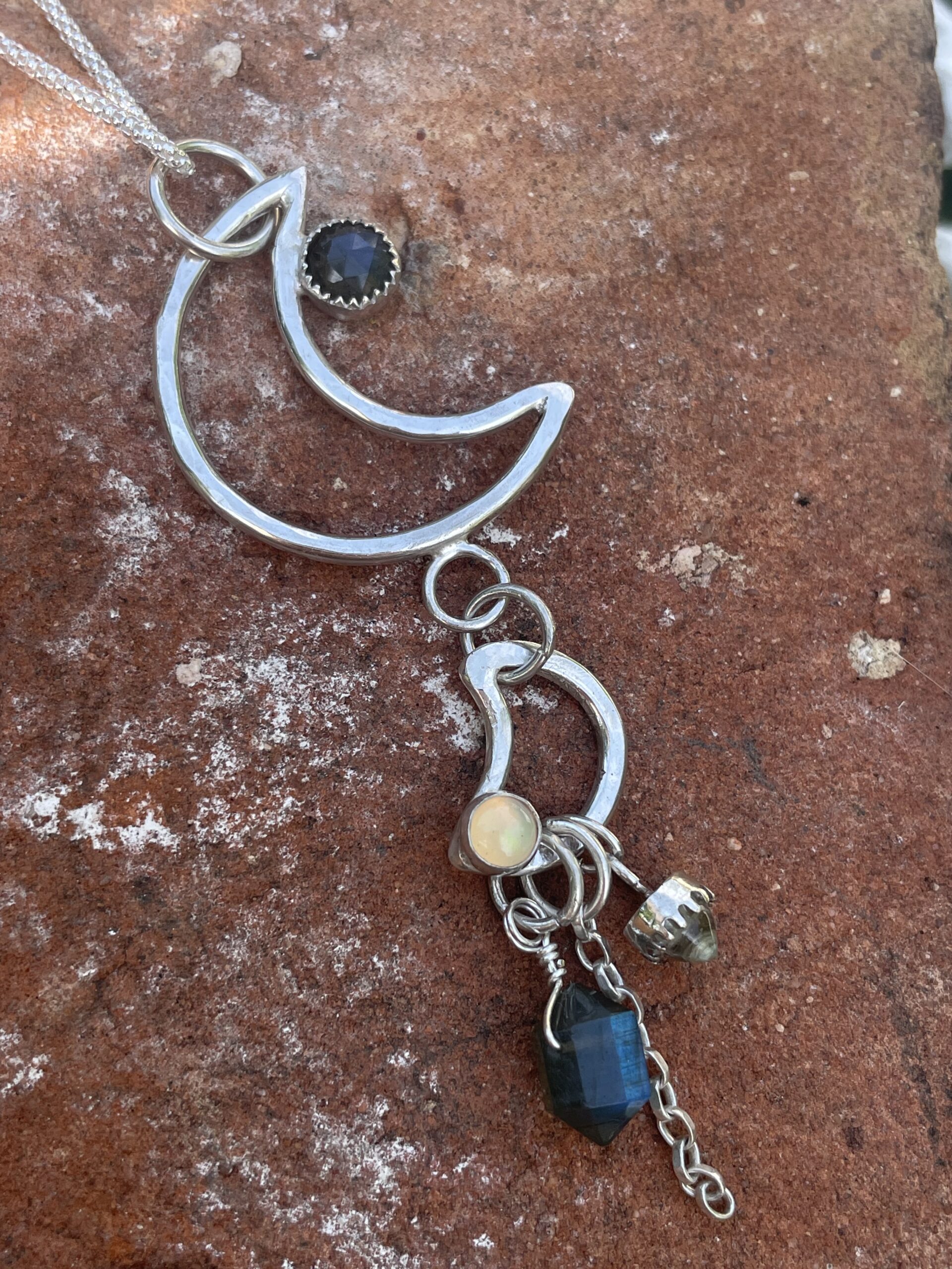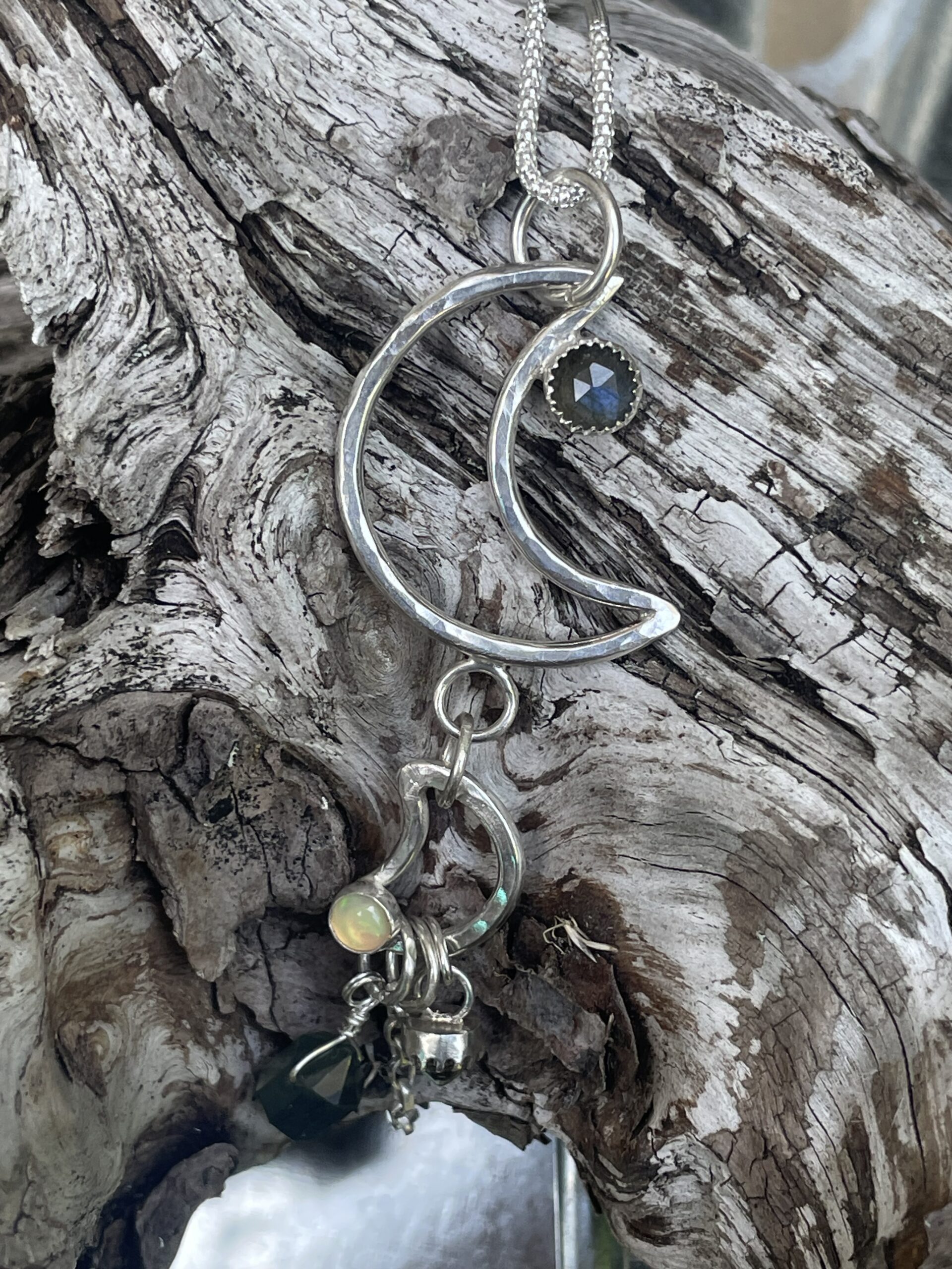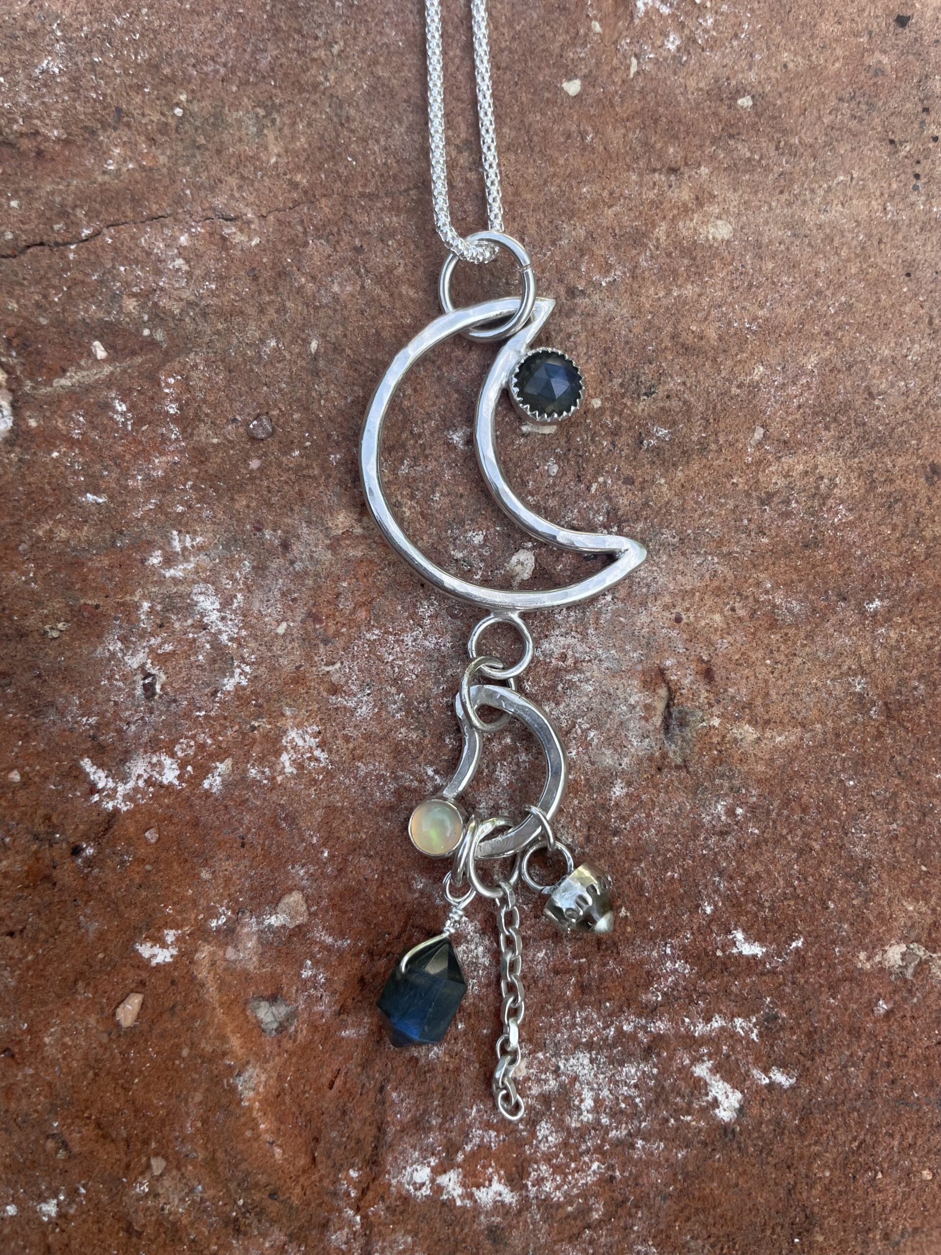 A stunning moon pendant crafted from sterling silver , featuring the captivating rainbow colours of Labradorite and the ethereal glow of opal. This piece embodies the beauty of the night sky, with each gemstone capturing the essence of the moonlight.