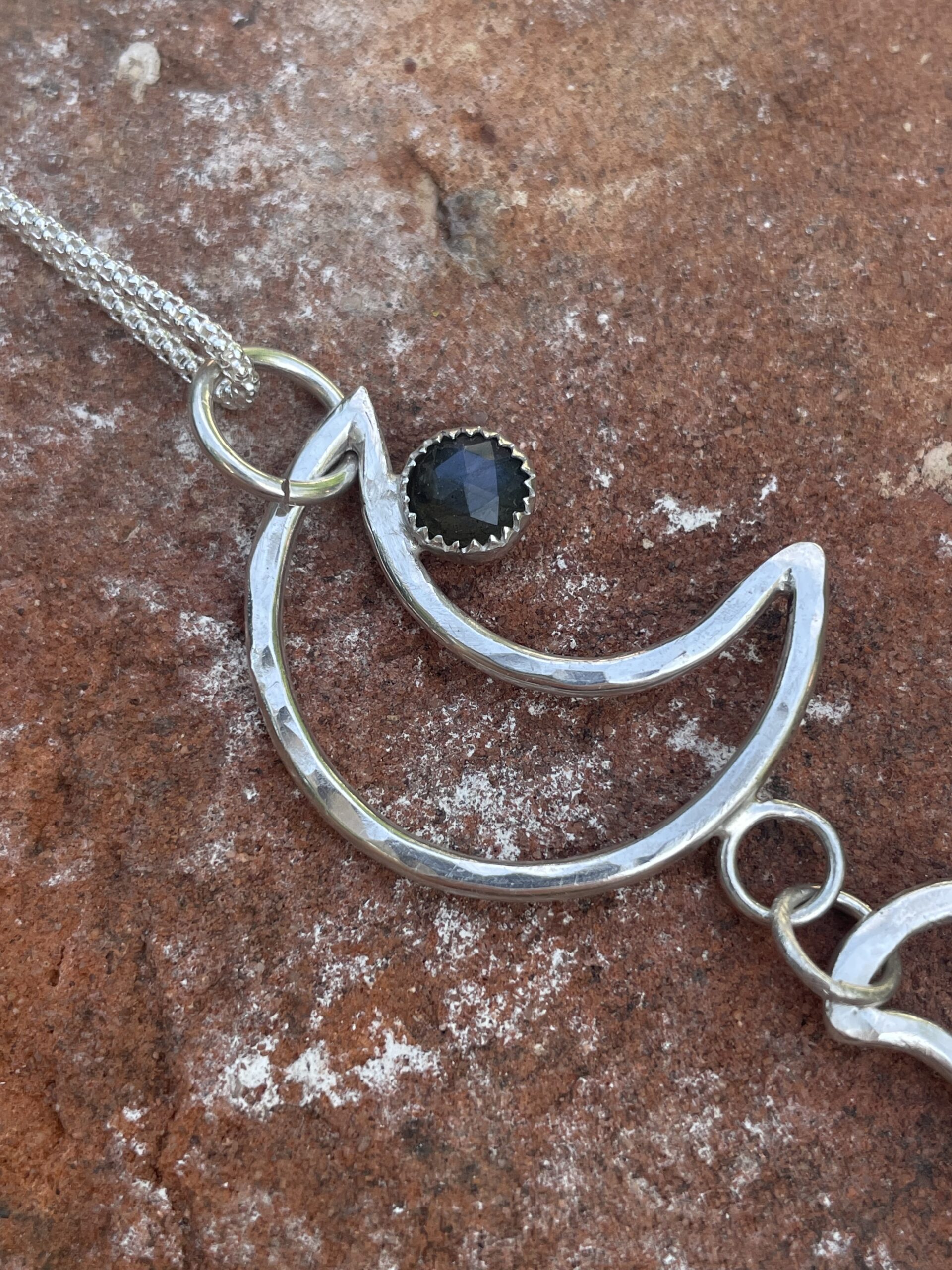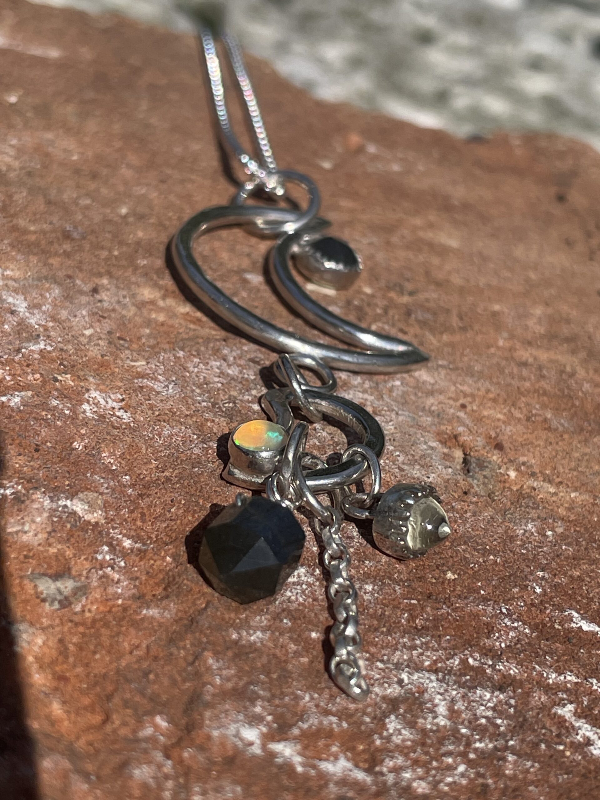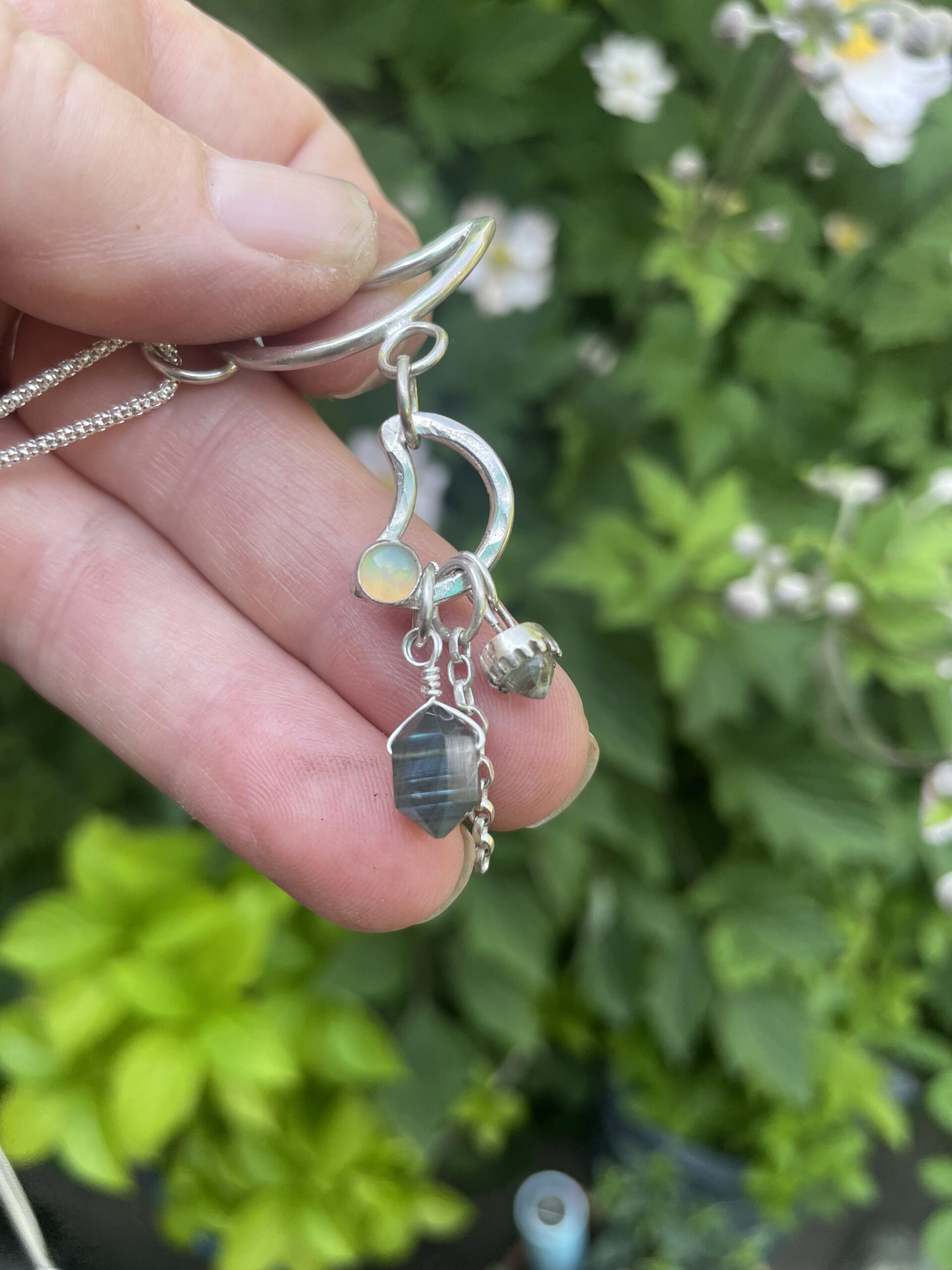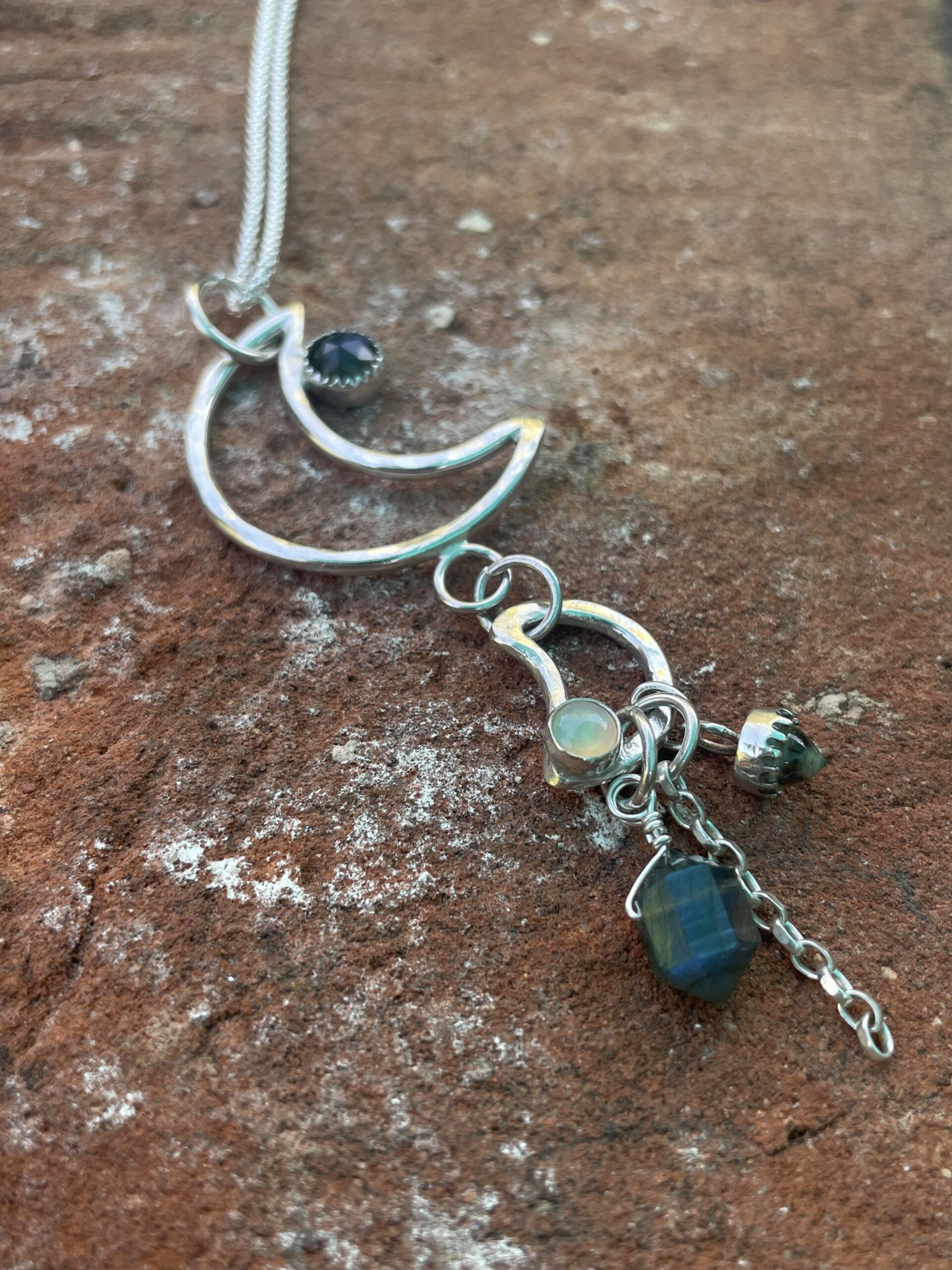 A stunning moon pendant crafted from sterling silver , featuring the captivating rainbow colours of Labradorite and the ethereal glow of opal. This piece embodies the beauty of the night sky, with each gemstone capturing the essence of the moonlight.